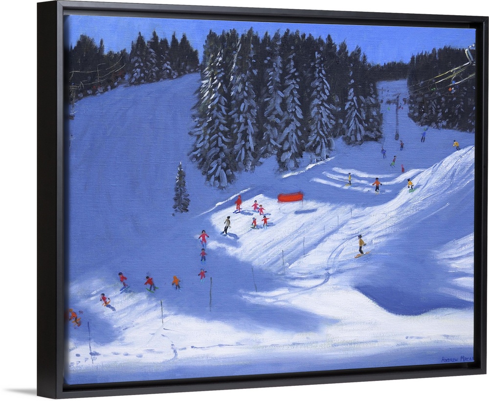 <p>Contemporary painting of a winter scene with people skiing down a hill.</p>