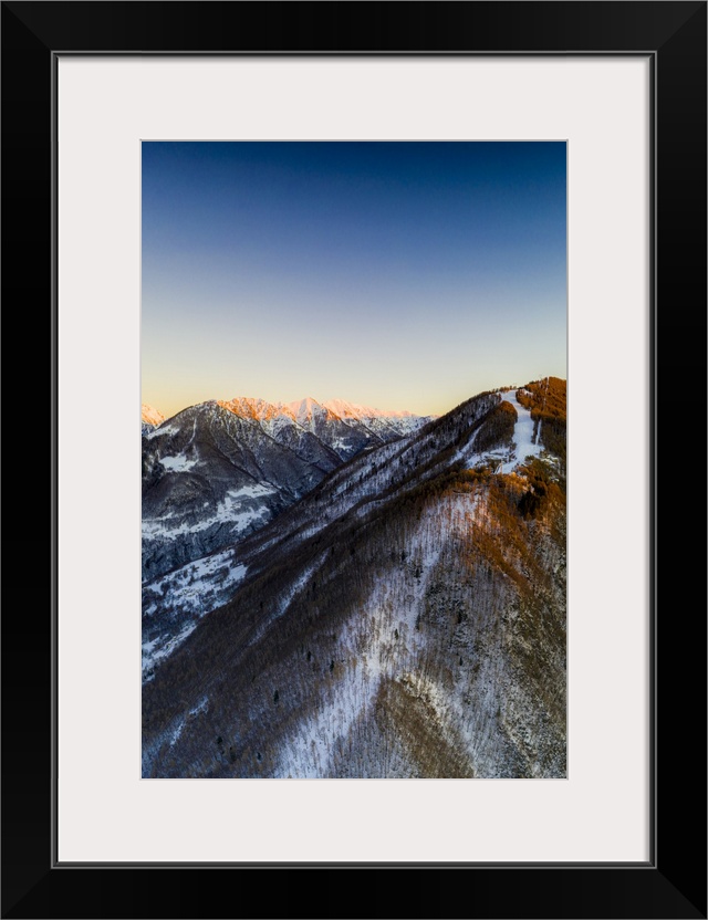<p>Aerial view by drone of ski slopes of Pian Delle Betulle and Alpe Paglio lit by sunset, Valsassina, Lecco province, Lombardy, Italy, Europe</p>