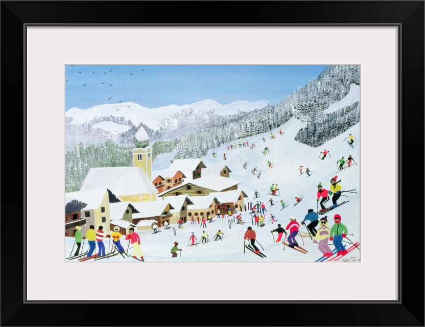 <p>Contemporary painting of people skiing at a mountain resort.</p>
