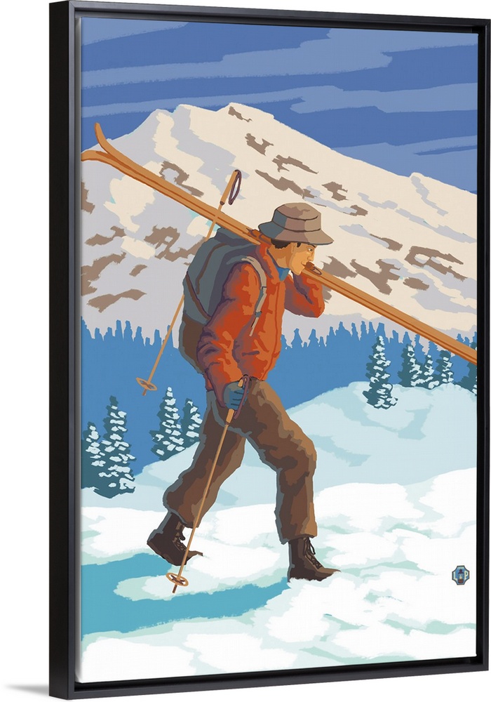 <p>Retro stylized art poster of a skier carrying skies, with a o mountain in the background.</p>