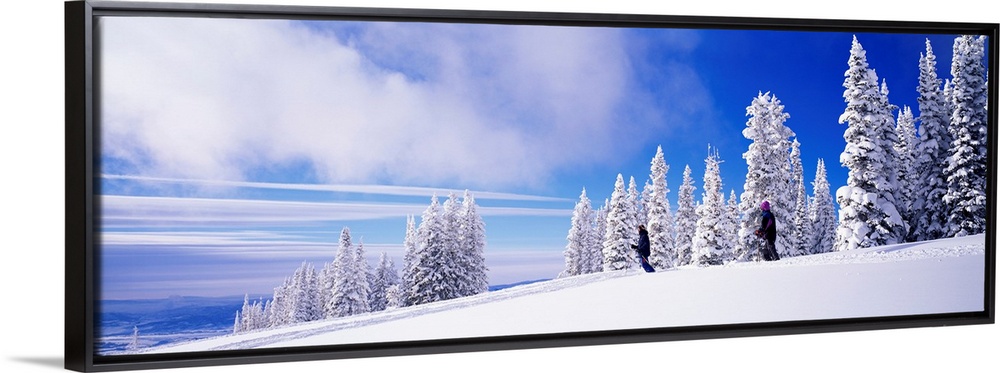 <p>Panoramic photograph focuses on two people skiing on a mountain recently blanketed with fresh snow. Behind the people is a scattered tree line covered with new powder.</p>