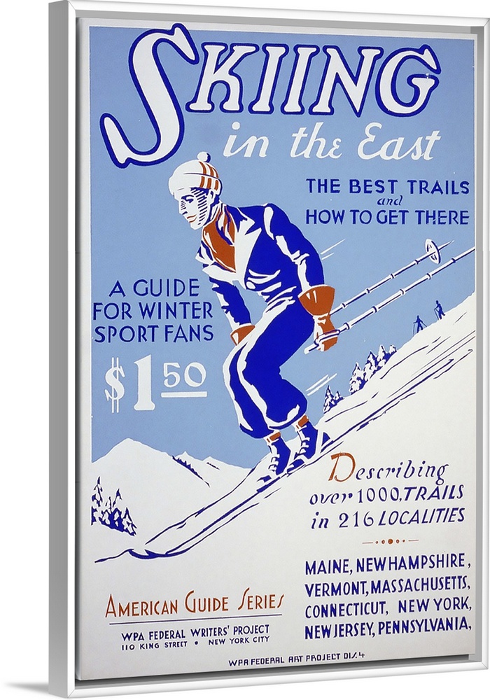 <p>Skiing in the East. The best trails and how to get there: A guide for winter sport fans. Describing over 1000 trails in 216 localities. Poster for WPA Federal Writers' Project, 110 King Street, New York City, American Guide Series guide to winter sports in the East (from Pennsylvania to Maine), showing a man skiing. Library of Congress, Prints and Photographs Division, WPA Poster Collection.</p>