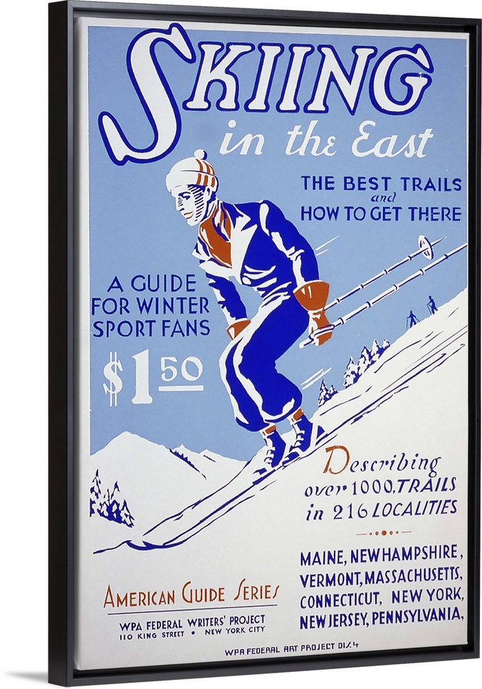 <p>Skiing in the East. The best trails and how to get there: A guide for winter sport fans. Describing over 1000 trails in 216 localities. Poster for WPA Federal Writers' Project, 110 King Street, New York City, American Guide Series guide to winter sports in the East (from Pennsylvania to Maine), showing a man skiing. Library of Congress, Prints and Photographs Division, WPA Poster Collection.</p>
