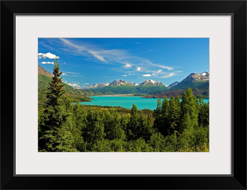 <p>Large canvas photo art of a forest surrounding a clear lake with snowcapped mountains in the distance.</p>