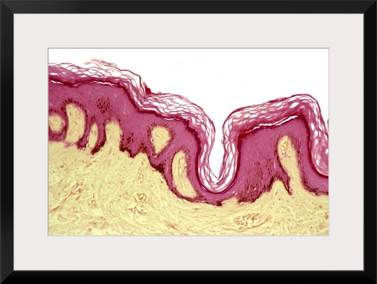 <p>Skin pigmentation from Addison's disease. Light micrograph of a section through the skin of a patient with Addison's disease. Also called hypocortisolism, Addison's is a hormonal disorder where the adrenal glands do not produce sufficient quantities of steroid hormones. One of the primary symptoms is hyperpigmentation of the skin, where the colour of the skin darkens in areas that are not exposed to the sun, for example the palms of the hands and nipples. Here, the excess pigment is seen as dark spots where the epithelial skin layer (pink) meets the underlying layer (yellow). Other symptoms include vitiligo (patches of lightened skin), low blood pressure, low blood sugar, fainting, vomiting and convulsions. Treatment is with hormone therapy.</p>