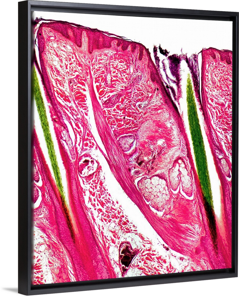 <p>Skin section. Semi-polarised light micrograph of a vertical section through human skin. The outer epidermis is the thin layer across top, with the dermis layer beneath it. The main feature here is two hair follicles containing hair (green) that grows from a bulbous root (not seen). Also seen here are the erector muscles (solid pink, strand seen at centre) and sebaceous glands (round, white-pink, two near centre). Magnification: x100 when printed at 10 centimetres high.</p>
