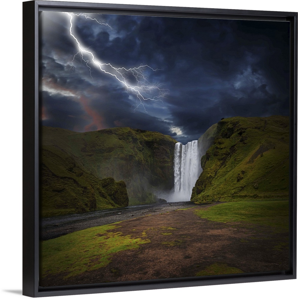<p>A photograph of lightning striking over a landscape with a waterfall in the distance.</p>