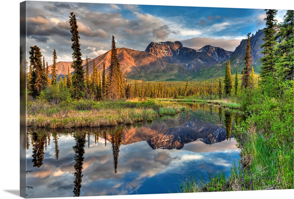 <p>Skookum Volcano reflecting in a pond along the Nabesna Road in Wrangell-St. Elias National Park and Preserve, Southcentral Alaska, Summer, HDR</p>