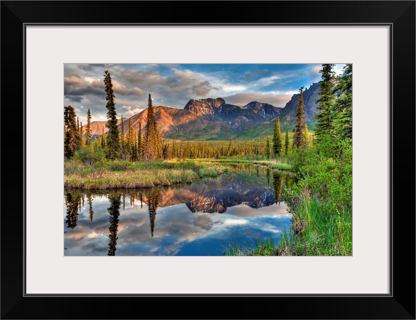 <p>Skookum Volcano reflecting in a pond along the Nabesna Road in Wrangell-St. Elias National Park and Preserve, Southcentral Alaska, Summer, HDR</p>