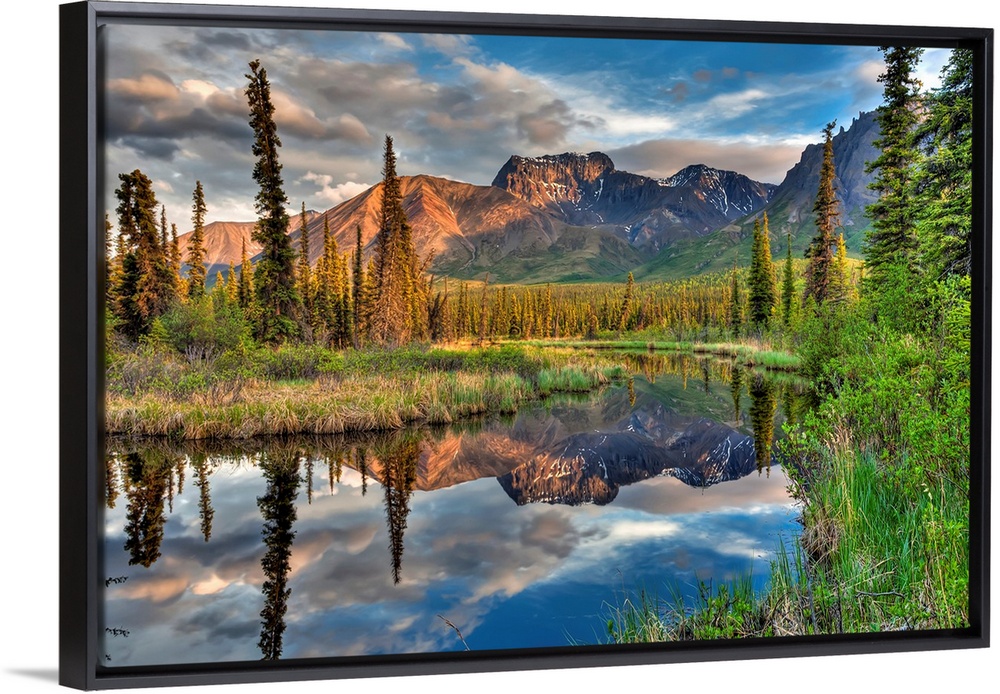 <p>Skookum Volcano reflecting in a pond along the Nabesna Road in Wrangell-St. Elias National Park and Preserve, Southcentral Alaska, Summer, HDR</p>