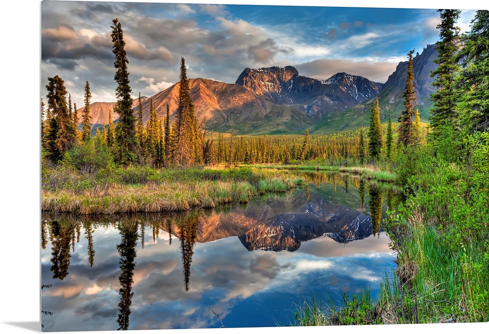 <p>Skookum Volcano reflecting in a pond along the Nabesna Road in Wrangell-St. Elias National Park and Preserve, Southcentral Alaska, Summer, HDR</p>