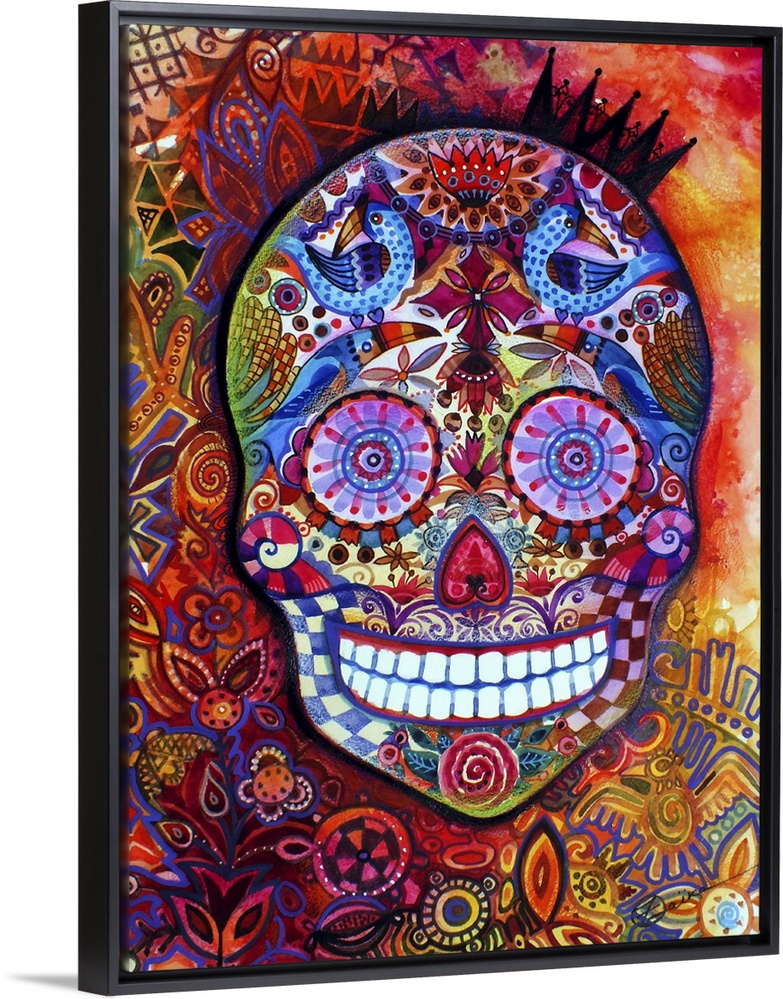 <p>Watercolor painting of a brightly patterned Day of the Dead sugar skull.</p>