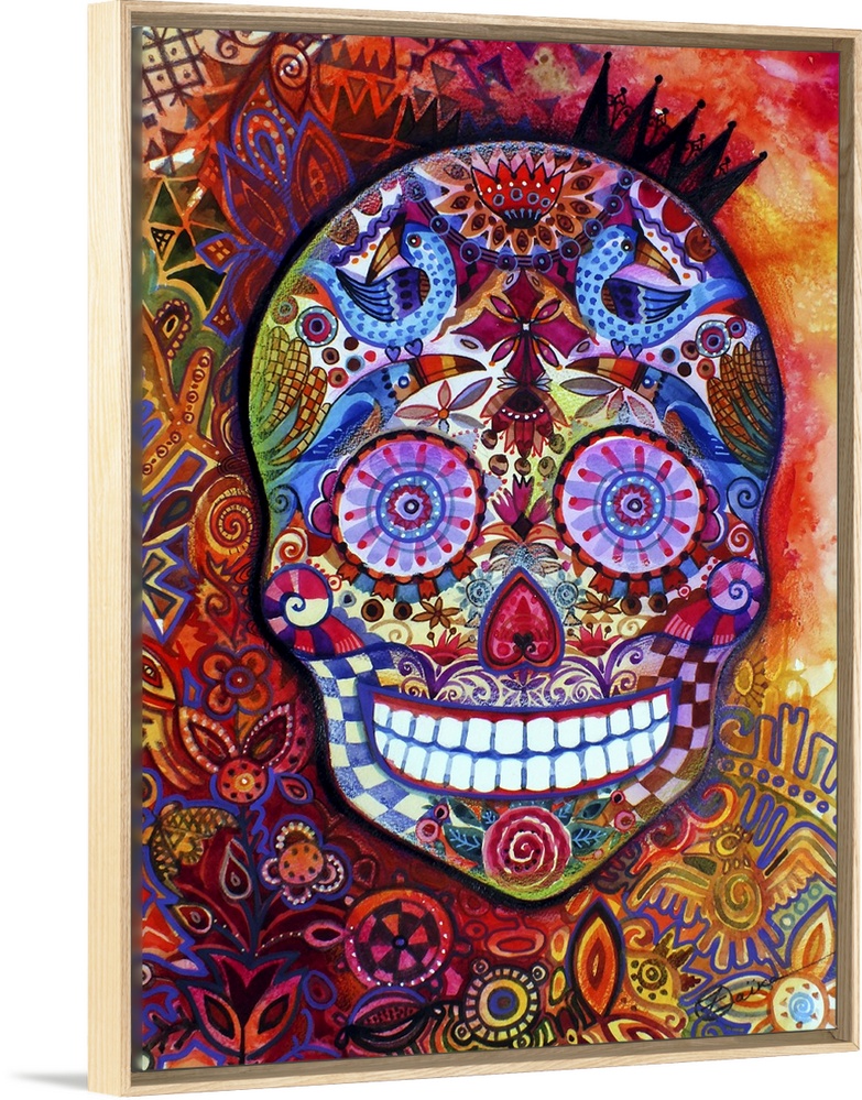 <p>Watercolor painting of a brightly patterned Day of the Dead sugar skull.</p>