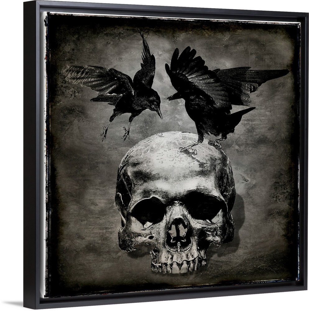 <p>Square Halloween decor with two crows landing on a skull.</p>