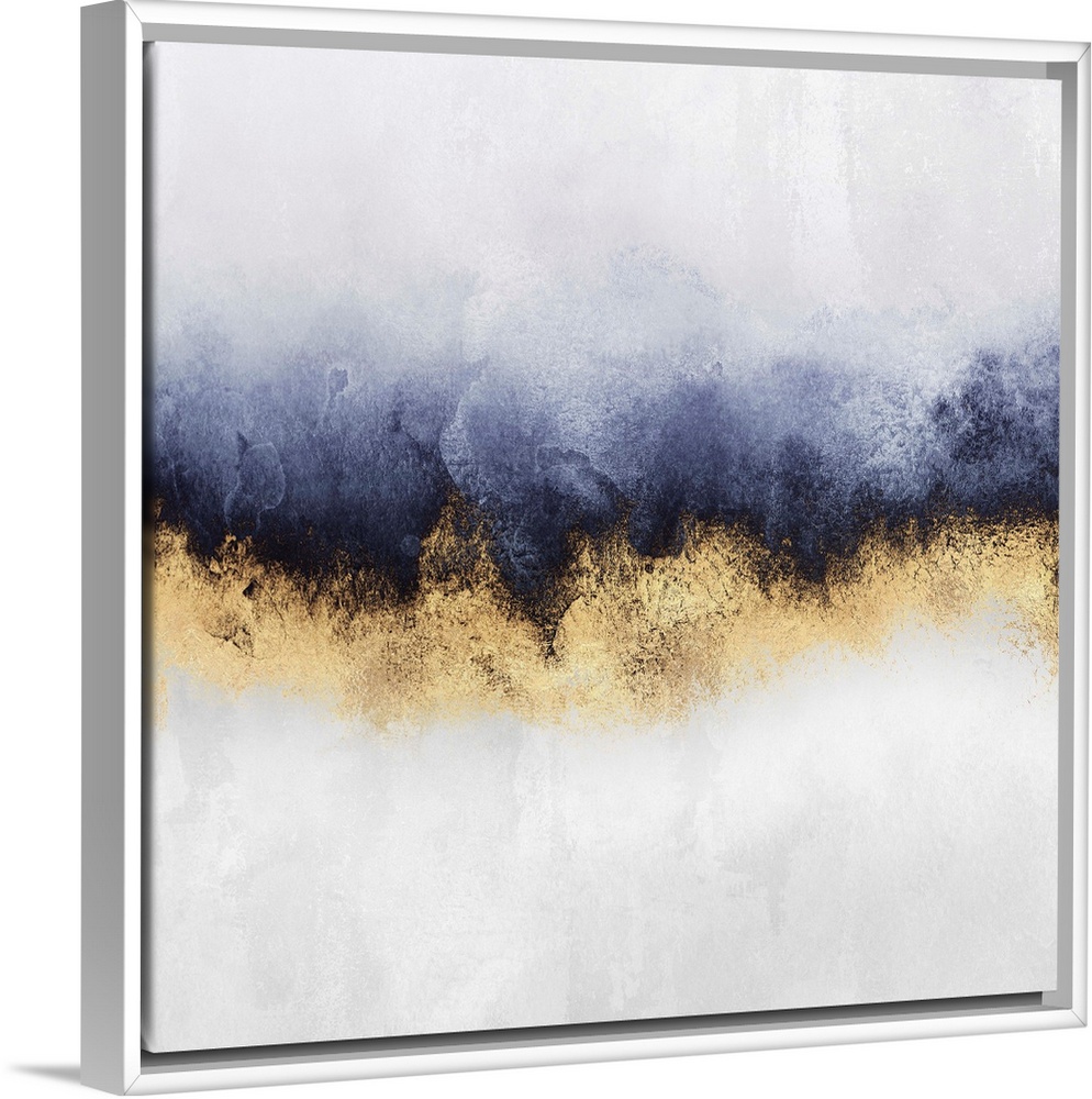 <p>Contemporary, square abstract design in shades of blue, indigo, ivory and gold, with bands of color appearing to merge horizontally across the picture.</p>