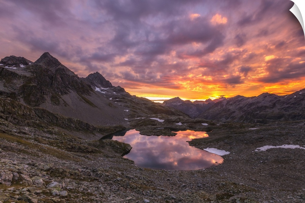 <p>Fiery sky at dawn reflected in Lai Ghiacciato framed by peaks, Val Ursaregls, Chiavenna Valley, Valtellina, Lombardy, Italy, Europe</p>