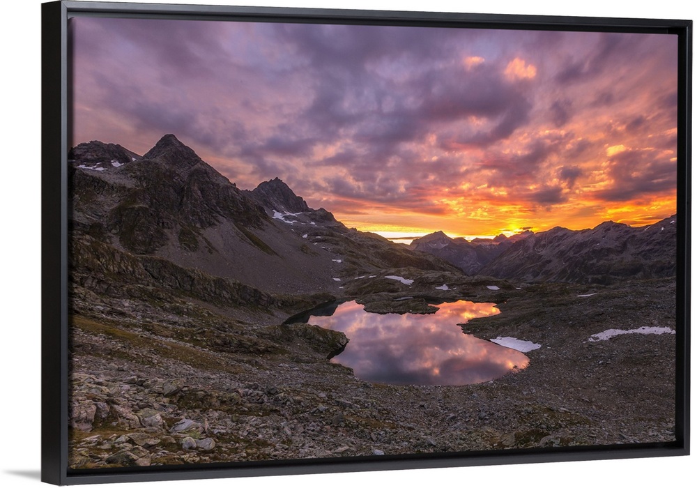 <p>Fiery sky at dawn reflected in Lai Ghiacciato framed by peaks, Val Ursaregls, Chiavenna Valley, Valtellina, Lombardy, Italy, Europe</p>