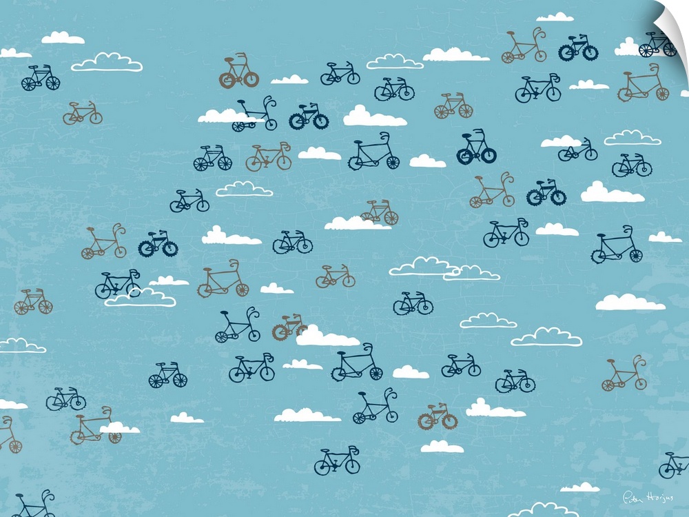 <p>A variety of bikes floating in the blue sky surrounded by white clouds.</p>