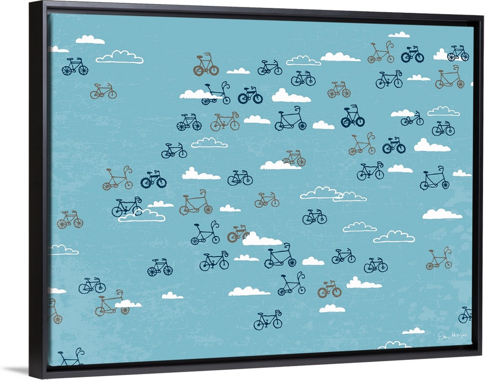 <p>A variety of bikes floating in the blue sky surrounded by white clouds.</p>