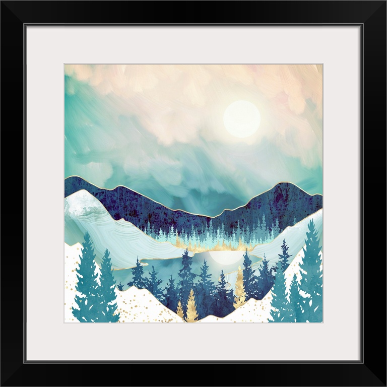 <p>Abstract landscape featuring a sky reflection with mountains, trees, mountains, gold and blue.</p>