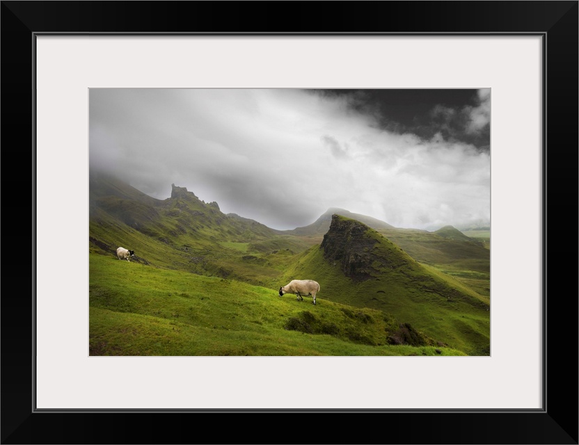 <p>Fine art photo of a misty valley full of large rocky outcroppings with two grazing sheep.</p>