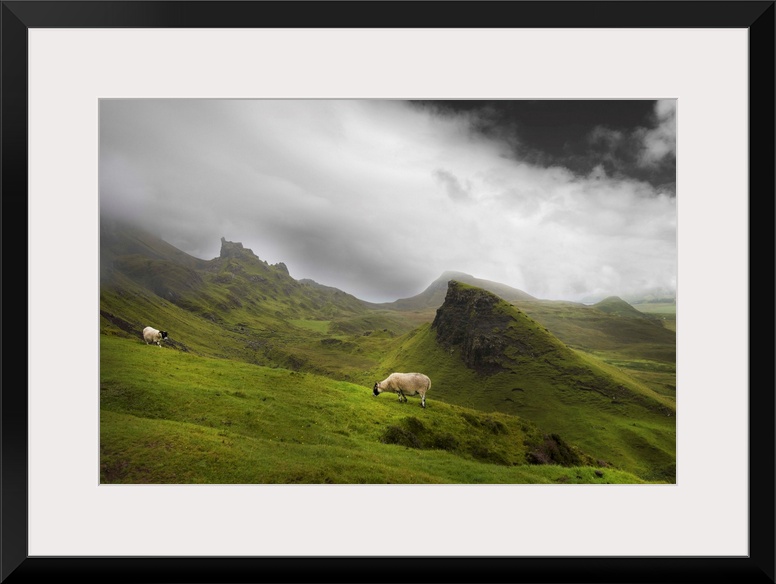 <p>Fine art photo of a misty valley full of large rocky outcroppings with two grazing sheep.</p>