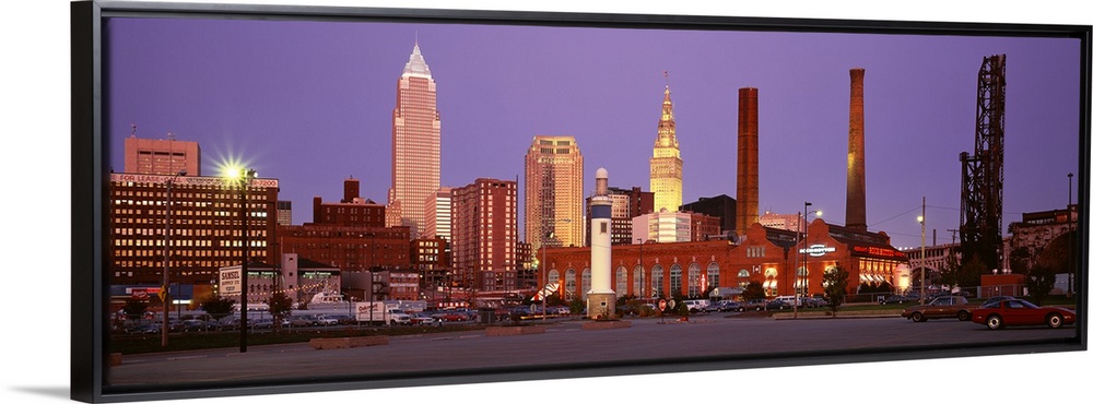 <p>Panoramic photograph of skyscrapers in Cleveland, Ohio, lit up at night.</p>