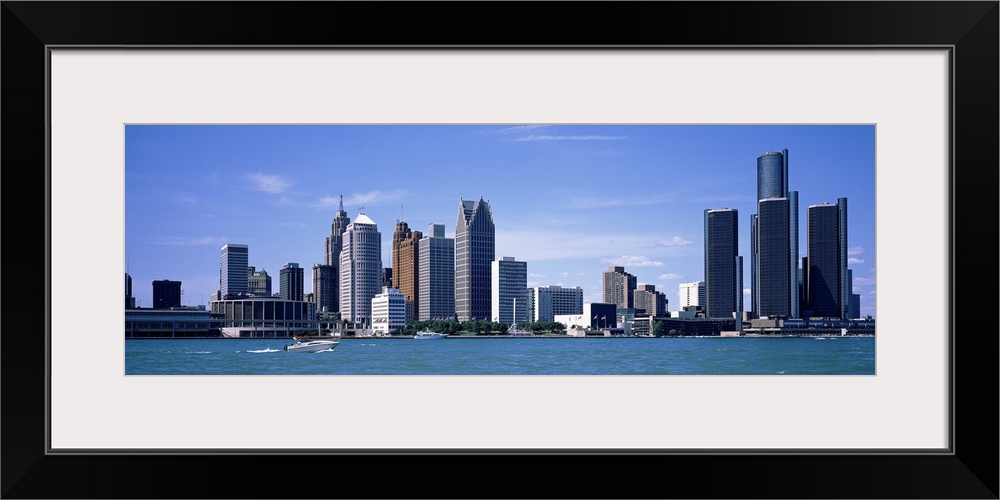 <p>Panoramic photograph taken of the Detroit skyline during the day with a body of water shown in front of the buildings.</p>