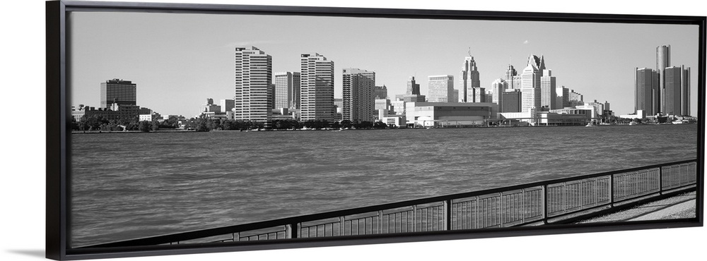 <p>This panoramic photograph is in black and white and taken of the Detroit skyline from across the river that is in front of it.</p>