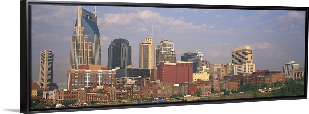 <p>Large horizontal panoramic photograph of the downtown Nashville, Tennesee (TN) skyline with skyscrapers and other buildings.</p>