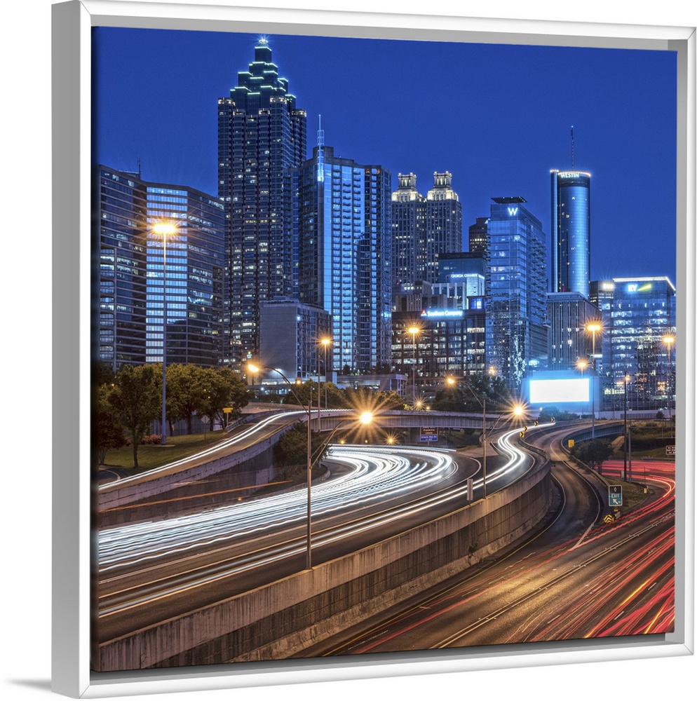 <p>City skyline of Atlanta, Georgia, illuminated night with light trails from passing traffic in the streets.</p>