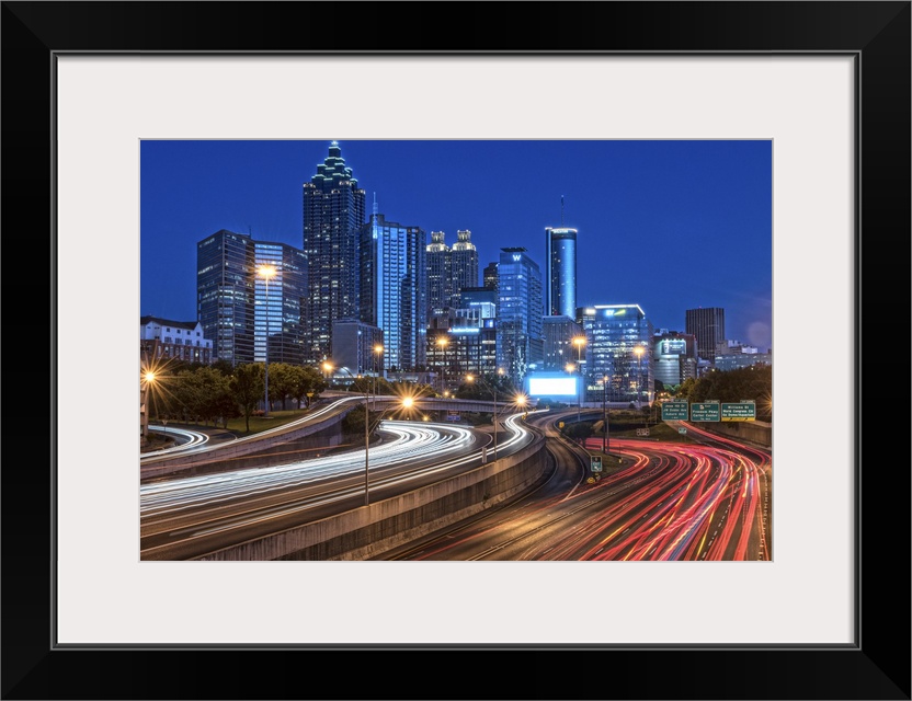 <p>City skyline of Atlanta, Georgia, illuminated night with light trails from passing traffic in the streets.</p>