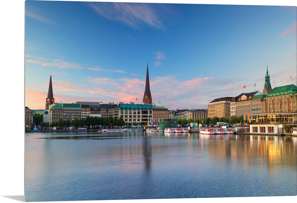 <p>Skyline of Binnenalster Lake at dawn, Hamburg, Germany.</p>