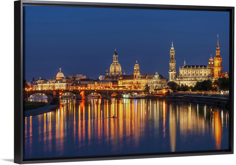 <p>Skyline of Dresden at dusk with Bruehl's Terrace ,Academy of Fine Arts, Church of Our Lady, Court Church and river Elbe, Dresden, Saxony, Germany.</p>