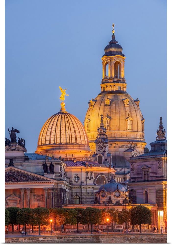<p>Skyline of Dresden at dusk with Bruehl's Terrace ,Academy of Fine Arts, Church of Our Lady, Dresden, Saxony, Germany.</p>