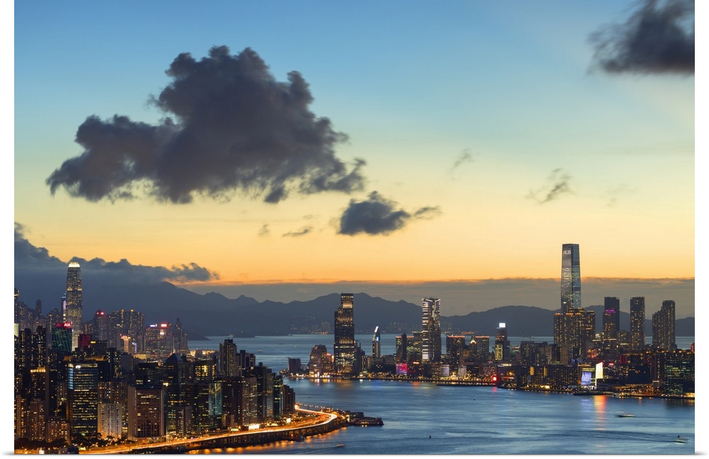 <p>Skyline of Hong Kong Island and Kowloon at sunset, Hong Kong</p>