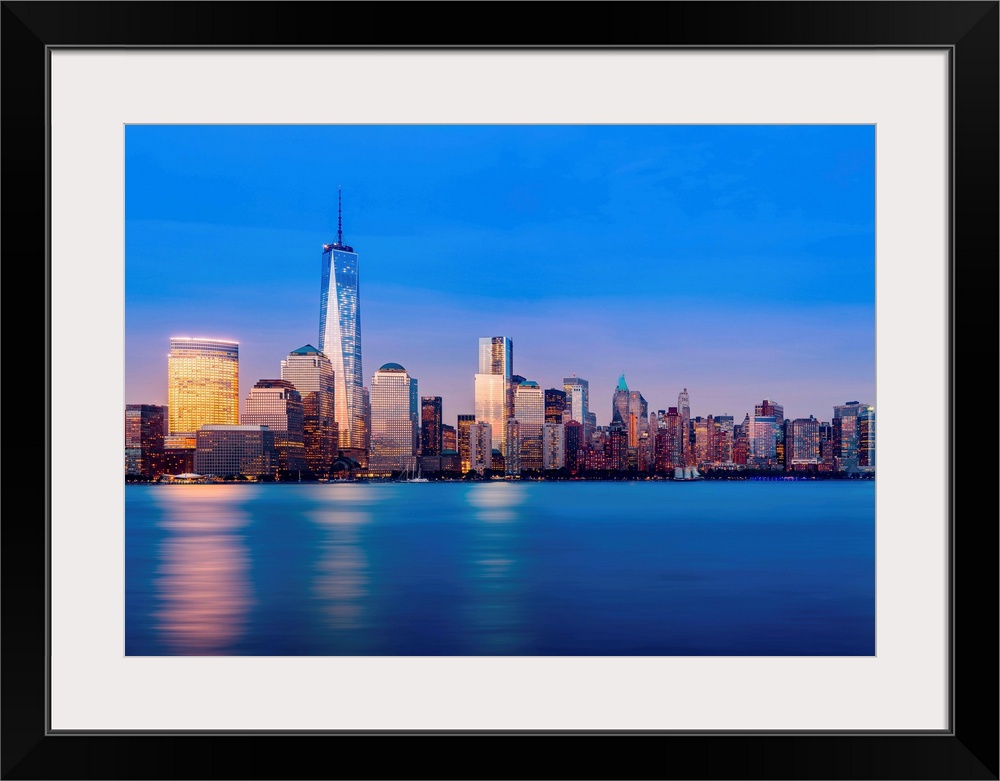 <p>Skyline of lower Manhattan of New York City at night with new One World Trade Center.</p>