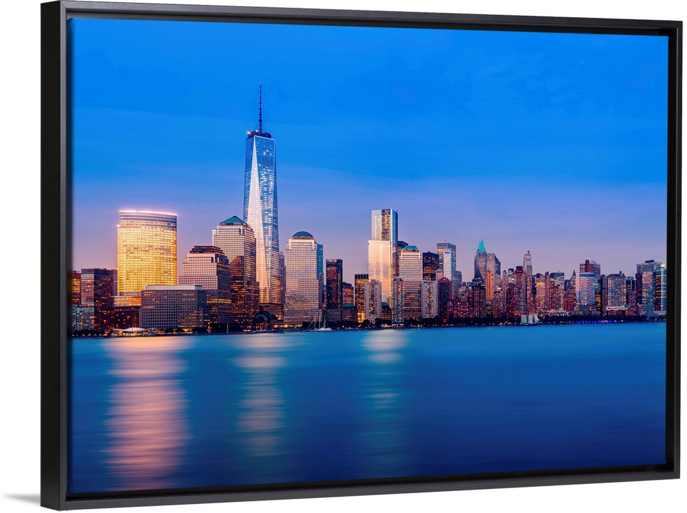 <p>Skyline of lower Manhattan of New York City at night with new One World Trade Center.</p>