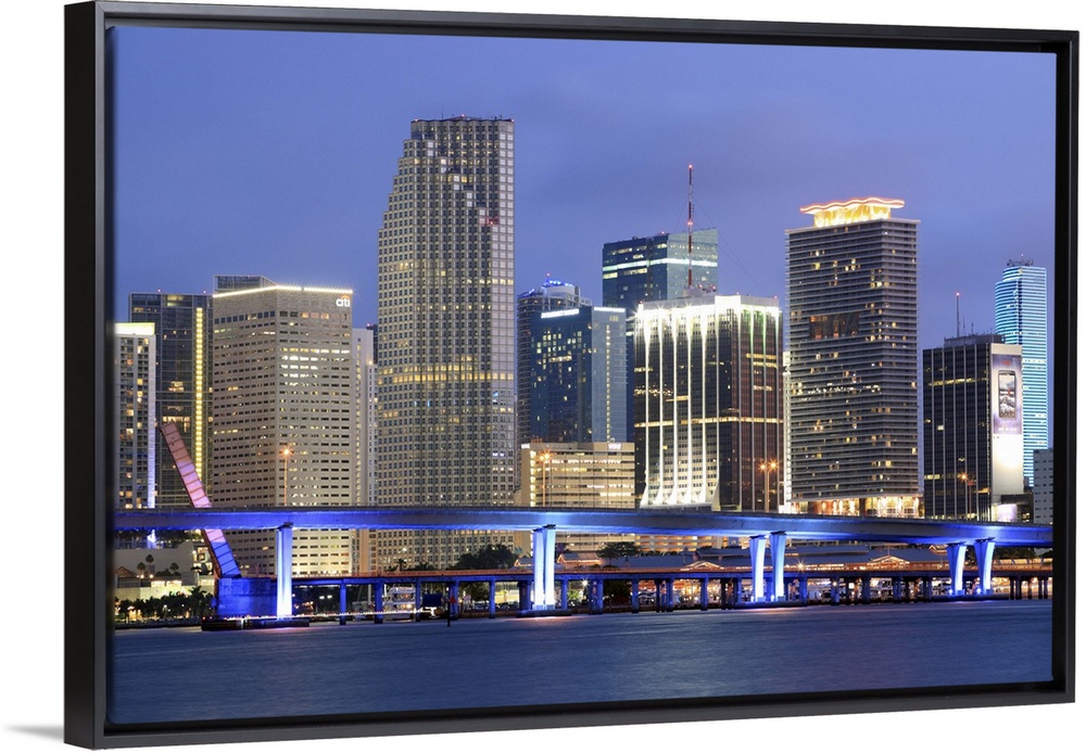 <p>Large canvas photo art of the Miami cityscape lit up at night along the waterfront.</p>