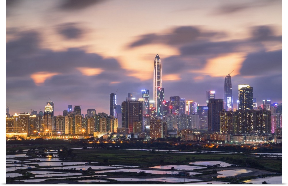 <p>Skyline of Shenzhen from Sheung Shui at sunset, New Territories, Hong Kong</p>
