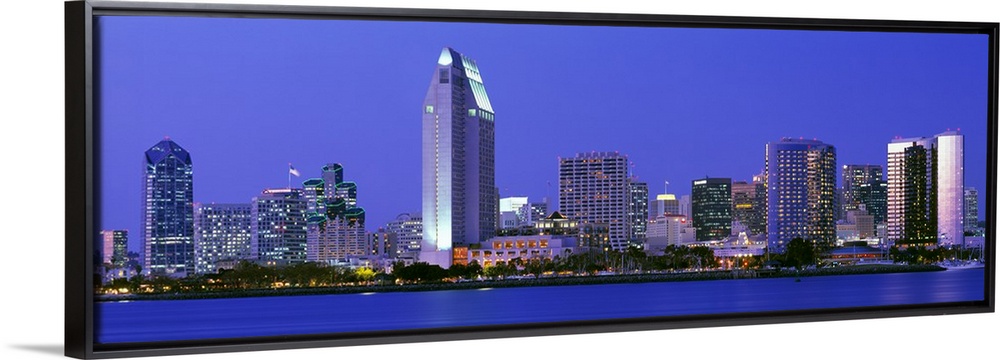 <p>Skyscrapers in San Diego are illuminated and photographed in panoramic view from across a body of water.</p>