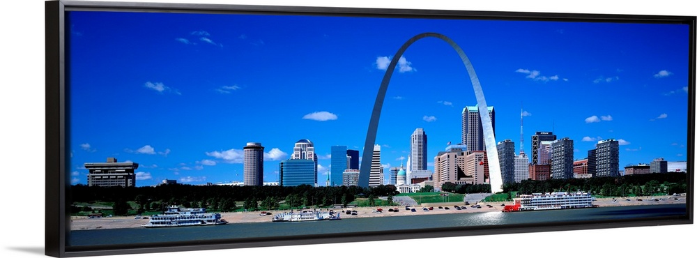 <p>Panoramic photograph of downtown district skyline and iconic arch on a sunny day with waterfront.</p>