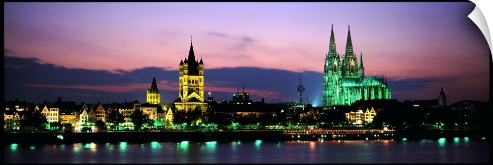 <p>Panoramic photo of a German cityscape lit up at night on the water.</p>