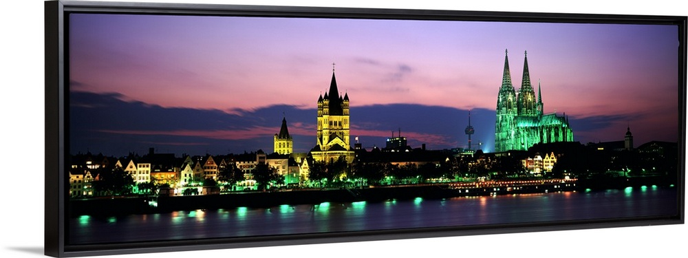 <p>Panoramic photo of a German cityscape lit up at night on the water.</p>