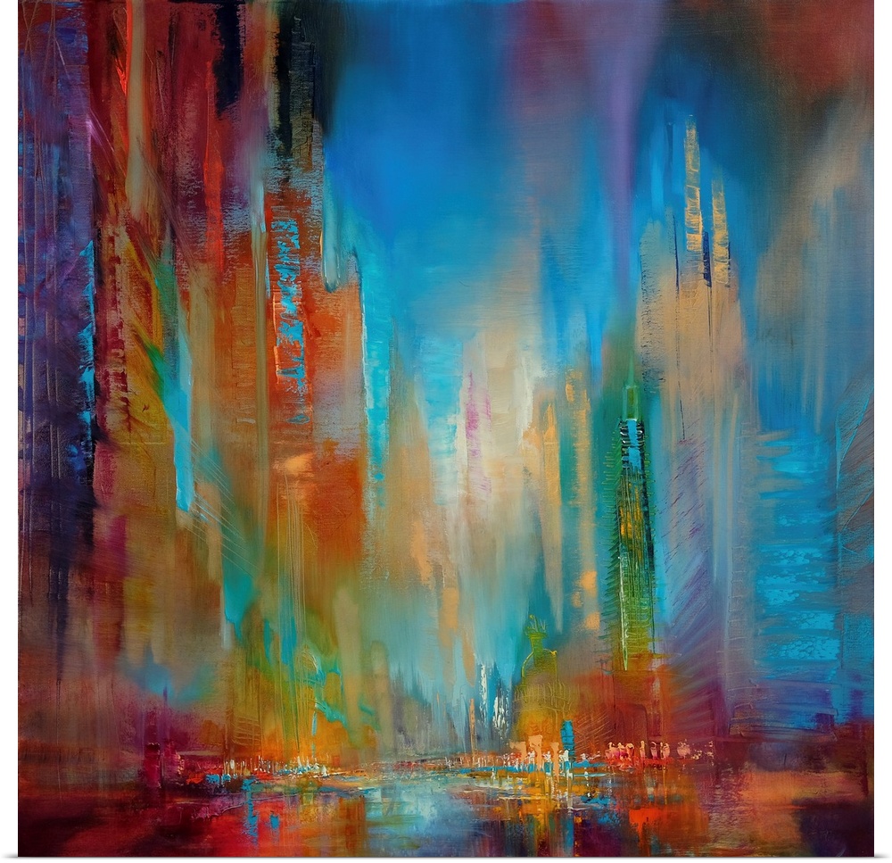 <p>Abstractly painted cityscape near the sea in bright colors and structures: a large, lively city in red, orange and blue with the silhouette of skyscrapers. Reflection of the lights in the water.</p>