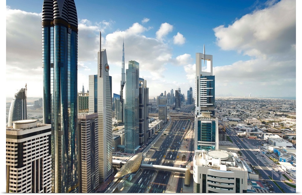 <p>Elevated view over the modern Skyscrapers along Sheikh Zayed Road looking towards the Burj Kalifa, Dubai, United Arab Emirates</p>