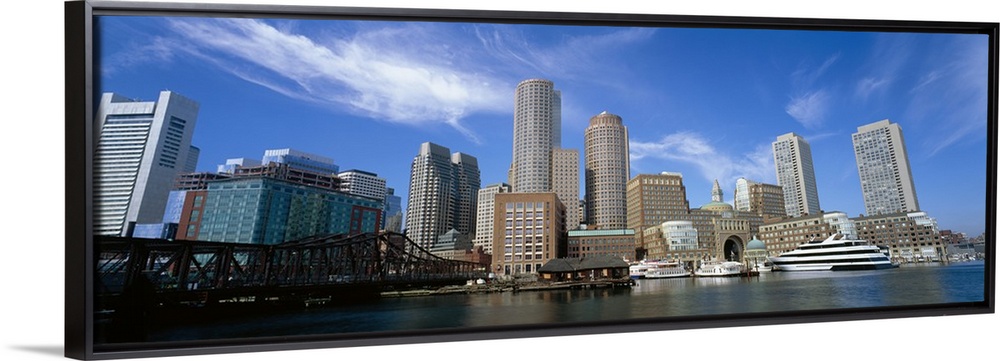 <p>The Boston skyline is photographed in panoramic view from the waterfront during a bright sunny day.</p>
