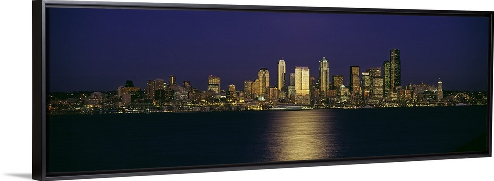 <p>Wide angle, distant photograph of the Seattle skyline, lit at night, over Elliott Bay in Washington.</p>