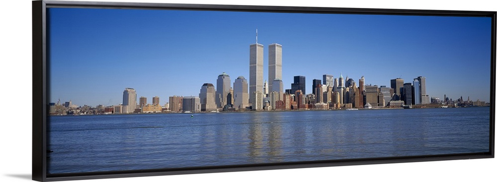 <p>Panoramic, distant photograph of the New York City skyline including the World Trade Center, reflecting in the water in the foreground.</p>