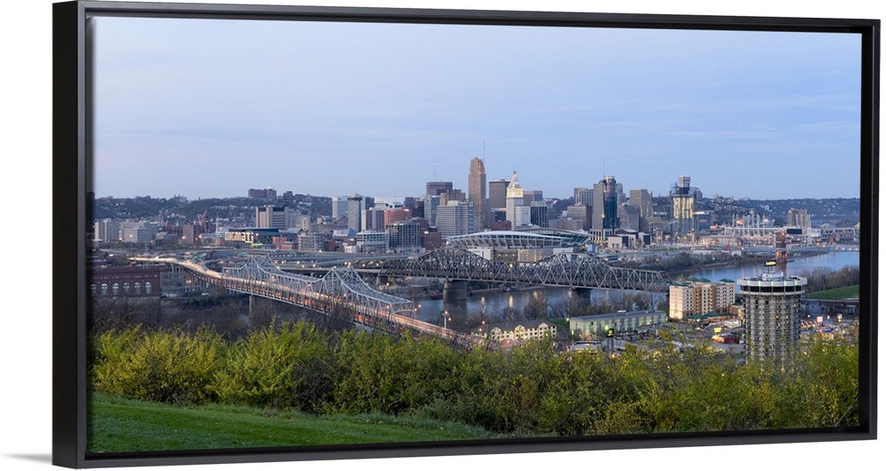 <p>Horizontal, distant photograph of bridges and skyscrapers of the Cincinnati, Ohio skyline, grass and a row of bushes in the foreground.</p>